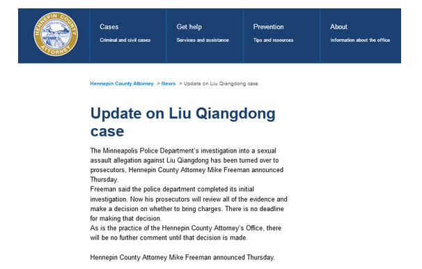 已沉寂一段時(shí)日的劉強(qiáng)東在美涉性侵案,剛剛突然又有新進(jìn)展。9月20日晚間,美國明尼蘇達(dá)州亨內(nèi)平縣檢察官辦公室發(fā)言人Chuck Laszewski宣布,明尼阿波利斯市警方對劉強(qiáng)東涉嫌性侵犯的指控已移交檢方。亨內(nèi)平縣檢察官麥克·弗里曼(Mike Freeman)說,警方完成了初步調(diào)查。現(xiàn)在,檢察官將審查所有證據(jù),并就是否提出指控作出決定。這個(gè)決定沒有最后期限。